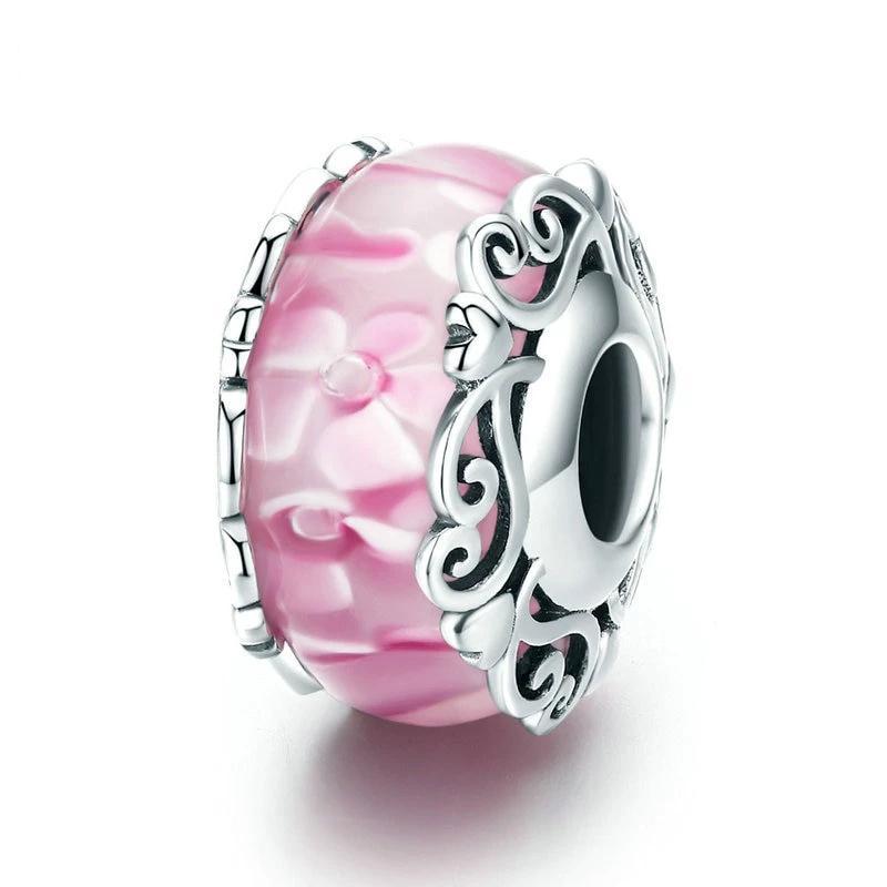Our vintage pattern flower beads are made of 100% sterling silver with iridescent, pink and transparent pink Murano glass. The layers of iridescent pink and exceptional craftsmanship create a raised bouquet of flowers on this Murano glass and sterling silver charm. Dots of dark and light pink glass form the handcrafted flowers, which are each beautifully different.